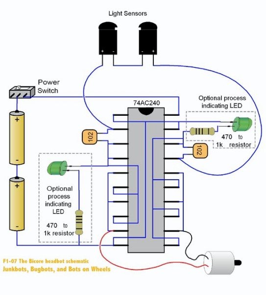 The robot spins, always looking for the brightest source of light in the room. The circuit is really simple: two IR LEDs detect light. As the LEDs detect light, they act as on/off switches, reversing the flow of electricity to the motor.