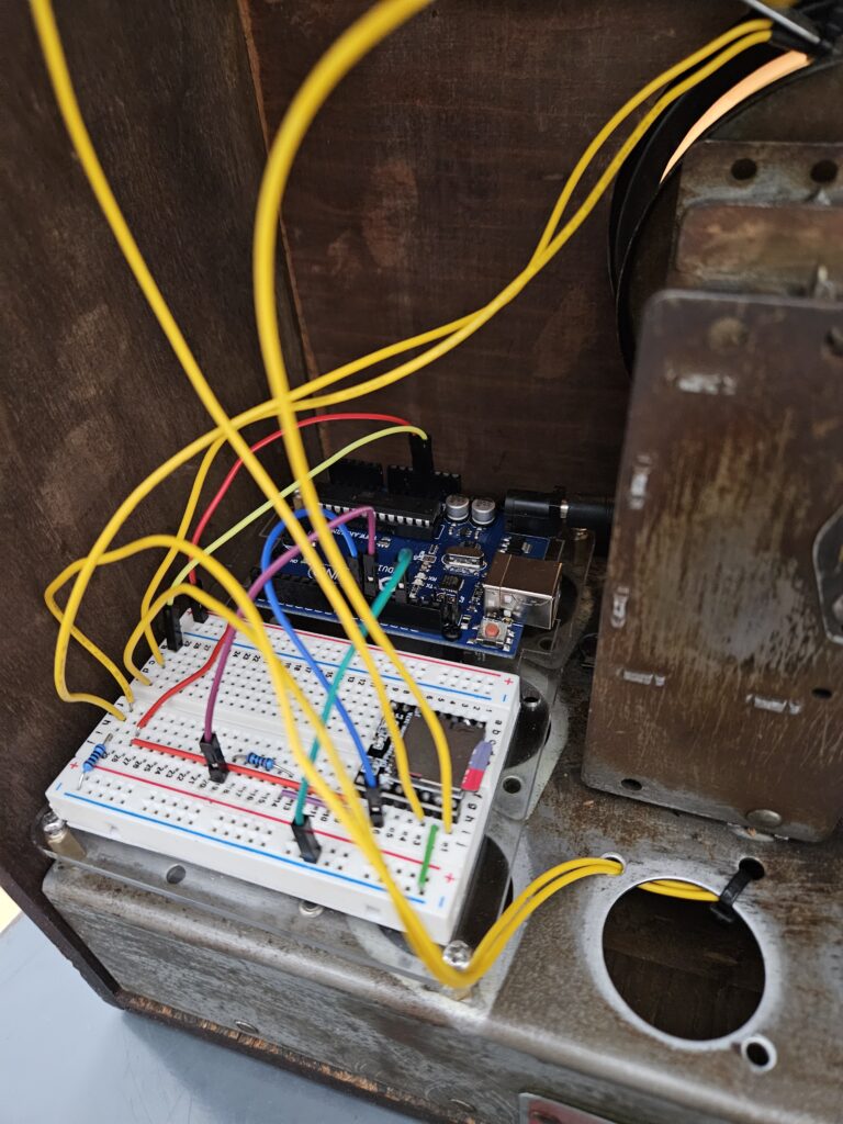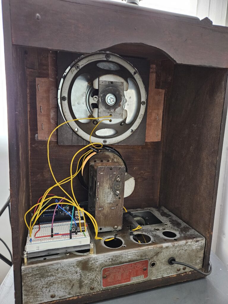 I cleaned and oiled the wood case, and salvaged what radio parts I could for future projects. From Temu, I purchased a fine copper mesh to use as speaker cloth ($2) and a DFPlayer Mini ($2). I loaded an SD card up with music from the 1920s to 1940s, then I wrote a simple script that will continuously play random tracks from the SD card. Using an Arduino and a 3W speaker I already had, I wired the circuit up. I decided to use the original radio knobs to control the Arduino, because that’s a lot more fun. I had to make a custom speaker mount out of some salvaged aluminum sheet I had, which turned out well. Finally, I put a couple of LEDs behind the dial to replace the original incandescent bulbs, and assembled everything. Here is the final result: