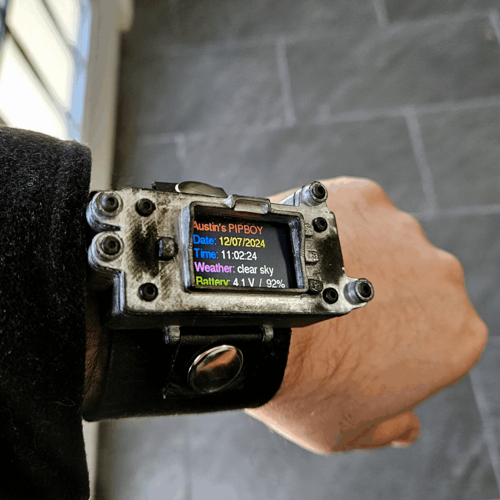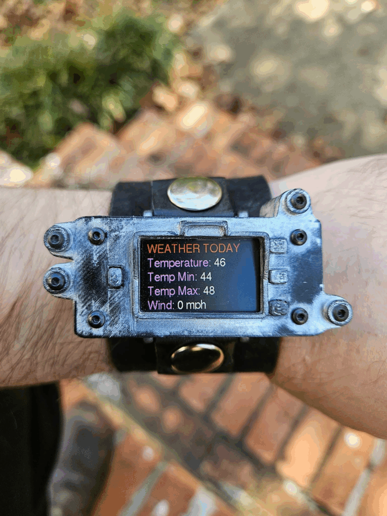 The way the watch works, is that on reset it gets the time and date from online NTP servers while connected to my home wifi. Then the ESP32-S2’s internal clock handles keeping track of time until the time is updated via NTP servers again. This seems to work well. (Traditionally, you would use a Real Time Clock or GPS module to keep accurate time, but that would have made the watch bulkier.) Likewise, I use OpenWeatherMap’s API to get weather data to the watch daily. I plan to add additional functionally in the future, but for now I’m happy with my Pipboy Mini.
