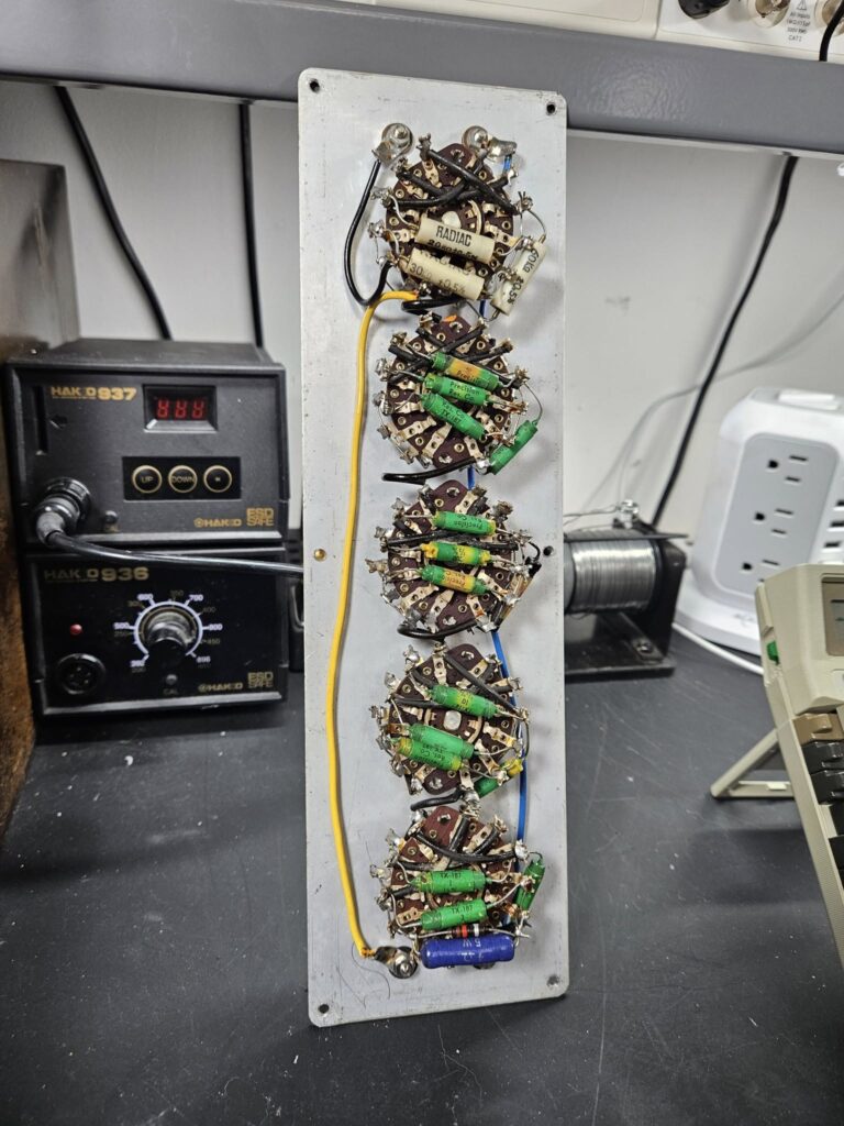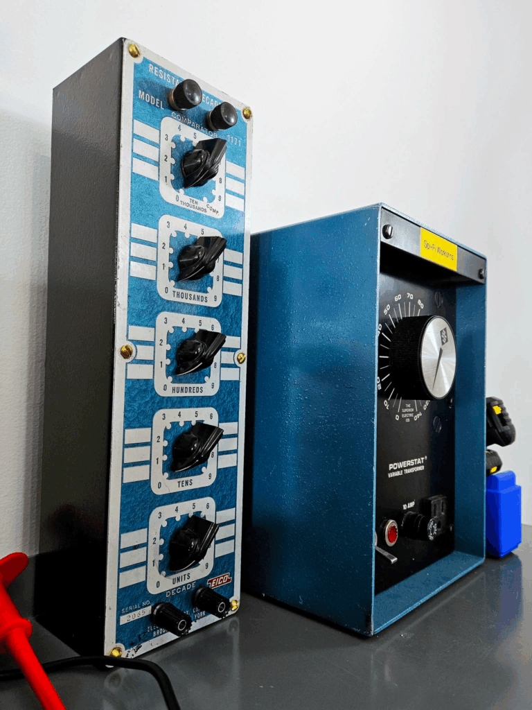 The steel box was a bit rusty, and it was caked in dirt, but after some cleaning it turned out that the aluminum faceplate was in great shape. I used Evapo-Rust to remove the rust on the box and then spray-painted it a nice black. Next, I sprayed the switches down with DeoxIT and tested all the resistors. Surprisingly, most were still in spec, however two were open, so I cut those out and soldered in replacements. While I was at it, I added banana jacks; now I can use all of my test cables with it. I also traded the rusty screws for brass, because pizazz.