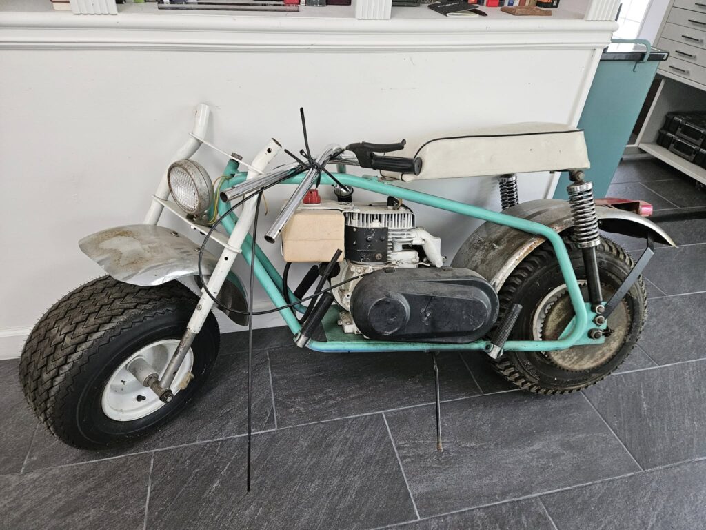 I have been looking for one of these for a while and I finally located one. This is a rare 1973 Carl Heald Super Bronc VT-8 minibike. For a brief period, the Heathkit company manufactured build-your-own bike kits, and they hired Carl Heald to design them. Later, Heathkit decided to focus on electronic equipment and dropped other departments. They sold the bike business back to Carl Heald, who started a new company that manufactured and sold a variety of simple vehicles that were powered by industrial motors. The Super Bronc line was marketed to farmers as a means of traveling off-road on large tracks of land. It’s basically a tank that can handle any terrain.