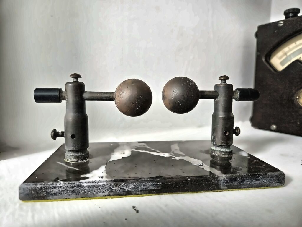 I was lucky enough to win this antique spark gap at an estate auction. Two iron spheres held by brass posts on a marble base.